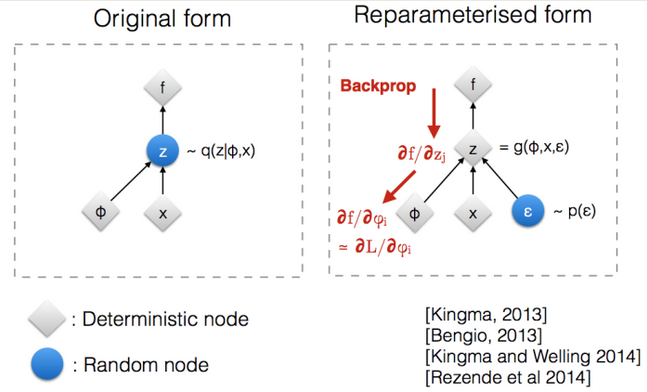 where \varepsilon is an auxiliary independent random variable and g_\phi converts \varepsilon to z.