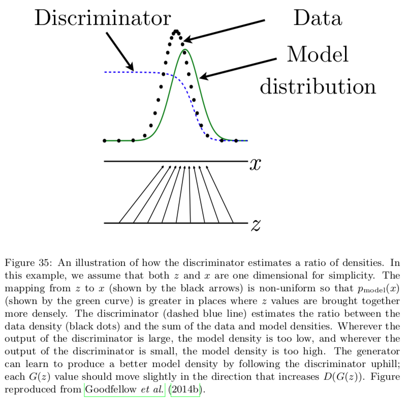 The discriminator (dashed blue line) estimates the ratio between the data density (black dots) and the sum of the data and model densities. Wherever the output of the discriminator is large, the model density is too low, and wherever the output of the discriminator is small, the model density is too high. Estimating this ratio is the key approximation mechanism used by GANs