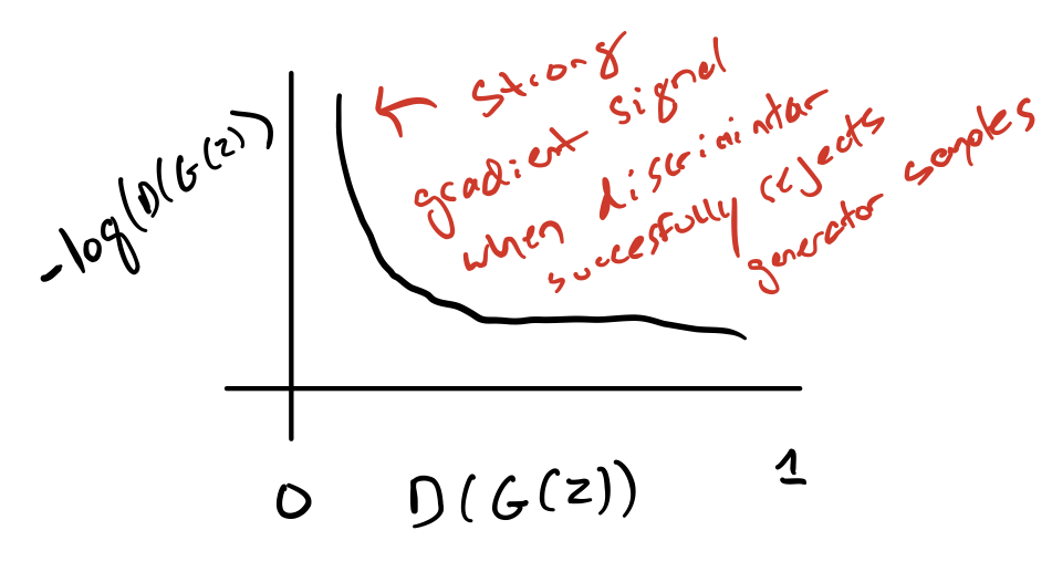 This leads to a strong gradient signal at D(G(z)) = 0.